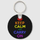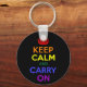 Keep Calm and Carry On vintage-style design in a rainbow of colors against a black background.