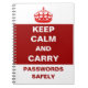 A personal notebook whose front cover displays a crown and the text 'Keep Calm and Carry Passwords Safely' in red and white.