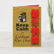Popular "Keep calm" with a royal Ram + large vertical red greetings in Chinese onto a golden background (printed image of textured paper). Design on vertical greeting card with red background inside of the card. Perfect for Chinese New Year of the Goat, Ram or Sheep Year with an occidental accent.
