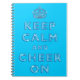 KEEP CALM AND CHEER ON Notebook for Cheerleaders. Pretty Turquoise background with turquoise glassy like font and Crown from the famous Keep Calm and Carry On poster. Cool gifts for cheerleaders.