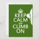 This reads Keep Calm and Climb On, in the style of the classic keep calm poster. There is a rock climber climbing to one side of the words. It makes a beautiful range of products, popular with anyone who loves to climb.