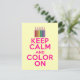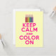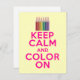 Keep calm and colour on. Relax by colouring with crayons, colour pencils and pastels. Pink keep calm font over a light yellow background with a set of coloured pencils at the top. Invitation for art parties!
