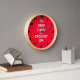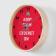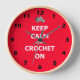 'This round, red wall clock for anyone who loves to crochet has the words, Keep calm and crochet on, and is decorated with a black and white skein of wool and two red crochet hooks. It has easy to read black numbers, and would be a lovely gift for anyone who loves to crochet.