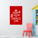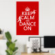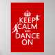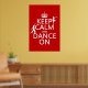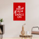 This reads Keep Calm and Dance On, in the style of the classic keep calm poster. There are two dancers dancing on top of the letters. It's a beautiful design, which makes great gifts for dance teachers, dancing groups, or anyone who loves dance.