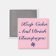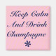 Keep calm and drink champagne! Blue lettering on a pink background with yellow bubbles.