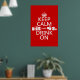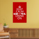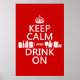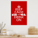 This reads Keep Calm and Drink On, in the style of the classic keep calm poster. It is decorated with silhouettes of a wide range of drinks all lined up in the middle. It's a fun classic design, great for advertising or promoting events.