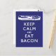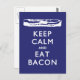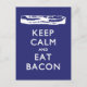 Keep Calm And Eat Bacon. Bacon will calm you, love you and keep you…. well, YOU! Devour delicious bacon and self-actualise. Based on the World War Two Poster, "KEEP CALM AND CARRY ON". White text and image over a navy blue background (#000080 Hex Colour).