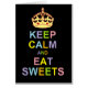 Keep Calm and Eat Sweets greeting card. Cute customisable card says Keep Calm and Eat Sweets in colourful letters with a crown on a black background.