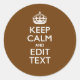 Your personalised Keep Calm saying on a fine custom brown accent colour decor. A personalised Keep Calm style saying on a one of a kind gift. Humourous or whimsical try on your creative words on two editable lines of text. Remember to use CAPITAL letters for best results.