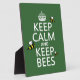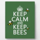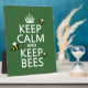 This reads Keep Calm and Keep Bees. Cartoon bees buzz alongside the words. It's a beautiful design, really popular with anyone interested in beekeeping and bee conservation.