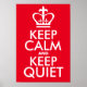 Keep calm poster design in red and white colour with text "Keep calm and keep quiet". If you want to change the background from red to any other you can change it using the 'customise it' button. It is a perfect poster for libraries or places where silence is necessary.