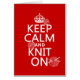 This reads Keep Calm and Knit On, in the style of the classic keep calm poster. There are balls of yarn and knitting needles nestling among the words. It's a beautiful design, which will please anyone who loves to knit. It makes a great range of presents for knitters, and home furnishings for crafting / sewing rooms.
