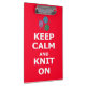 A useful clipboard to hold your knitting pattern in place, with the words "Keep Calm and Knit On" on both sides, in white on a red background. It is decorated with a drawing of three balls of yarn and knitting needles. You can personalize the back with your name.