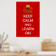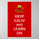 This poster features a red background, with an image of a green apple on three red books, and white text that reads, "Keep Calm and Learn On".