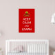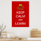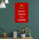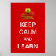 This poster features a red background, with an image of three red books and a green apple, above white text that reads, "Keep Calm and Learn". Perfect for a school or teacher!