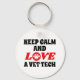 This keychain displays the text "KEEP CALM AND LOVE A VET TECH" in black and red font. The "O" in LOVE is replaced with a cute paw print. The text can be customised to say "veterinarian, "dog groomer," or the career of your choice.