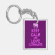 Keep Calm and Love Elephants. A light pink adult elephant with pink Keep Calm font over a dark purple background.