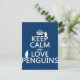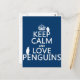 The design reads Keep Calm and Love Penguins, in the style of the classic poster. There are silhouettes of penguins standing happily on the letters. It's a stylish design, which makes great products for anyone who loves penguins.