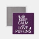 This reads 'Keep Calm and Love Puffins'. Two puffin silhouettes stand on the letters. It's an elegant, clean design, perfect for anyone who loves puffins.