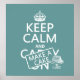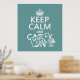 This reads Keep Calm and Make a Cake, in the style of the classic keep calm poster. The final words have been added as though on a sticker or a stamp over the original. There is a grand looking cake standing by the words. It's a fun and beautiful design, with a sense of decadence. Perfect for any tea room or bakery, and a lovely gift for anyone who loves cake.