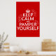 This reads Keep Calm and Pamper Yourself, in the style of the classic keep calm poster. the words are decorated with swirls and curls. It's a beautiful design, which makes great gifts for anyone who deserves to pamper themselves. Also beautiful adverts and promotions for beauty salons and the like.