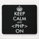 Keep Calm and PHP on Mousepad | Geeky humour for programmers and coders. Create your own funny Keep calm and carry on parody. For example with html php java javascript perl sql. Customise background colours and text the way you want it.