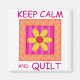 Show off your love of quilting with this fun and colourful quilt block proclaiming "Keep Calm and Quilt". This design is original quilt art with a colourful appliqué flower patchwork block. The word "quilt" is easy to change to another word of your choice. The quilt design is in vibrant and dynamic colours of orange, yellow and pink for a beautiful colour palette. Fully customisable to personalise. Quilt art is original art from fabric and quilt designer Phyllis Dobbs. This art is available on other products and in several colour backgrounds and is also available on more Keep Calm products with different quilt art. More products are available in Phyllis' BusinessWithFlair store.