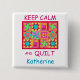 Show off your love of quilting with this fun and colourful quilt block name badge pin proclaiming "Keep Calm and Quilt". Wear to meetings and events to introduce yourself. This design is original quilt art and favourite patchwork quilt blocks plus unique blocks including log cabin, pinwheel, star, and square in a square blocks. The word "quilt" is easy to change to another word of your choice. The quilt design is in vibrant and dynamic colours of orange, yellow, pink, turquoise, and lime green for a beautiful colour palette. Fully customisable to personalise. Quilt art is original art from fabric and quilt designer Phyllis Dobbs. This art is available on other products and in several colour backgrounds and is also available on more Keep Calm products with different quilt art. More products are available in Phyllis' BusinessWithFlair store.