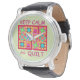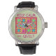 Show off your love of quilting with this fun and colourful quilt block wrist watch proclaiming "Keep Calm and Quilt" on a light green background. This design is original quilt art and favourite patchwork quilt blocks plus unique blocks including log cabin, pinwheel, star, and square in a square blocks. The word "quilt" is easy to change to another word of your choice. The quilt design is in vibrant and dynamic colours of orange, yellow, pink, turquoise, and lime green for a beautiful colour palette. Fully customisable to personalise. Quilt art is original art from fabric and quilt designer Phyllis Dobbs. This art is available on other products and in several colour backgrounds and is also available on more Keep Calm products with different quilt art. More products are available in Phyllis' BusinessWithFlair store.