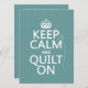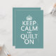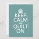 This reads Keep Calm and Quilt On, in the style of the classic keep calm poster. There is a needle piercing the letters, with thread dangling. It's a whimsical beautiful design which appeals to everyone who loves to quilt.
