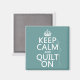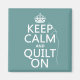This reads Keep Calm and Quilt On, in the style of the classic keep calm poster. There is a needle piercing the letters, with thread dangling. It's a whimsical beautiful design which appeals to everyone who loves to quilt.