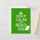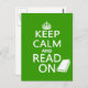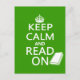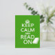 This is the classic "Keep Calm and Carry On" war poster, reworded to "Keep Calm and Read On". It's written in white on coloured background, and is accompanied by a silhouette of a book to one side.