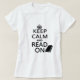 This is the classic "Keep Calm and Carry On" war poster, reworded to "Keep Calm and Read On". It's written in white on coloured background, and is accompanied by a silhouette of a book to one side.