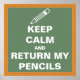 Do your students ask to borrow pencils and then never return them? Remind your students to return your pencils by placing this poster in your classroom. This poster displays a picture of a chalkboard with the text "KEEP CALM AND RETURN MY PENCILS" in a white font.