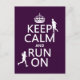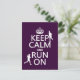 This design reads 'Keep Calm and Run On' in the style of the classic keep calm poster, including the crown at the top. There are silhouettes of two figures running over the letters. Great as gifts or treats for anyone who is in training or loves to run. Great presents for coaches and trainers.