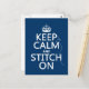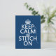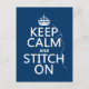 This reads Keep Calm and Stitch On, in the style of the classic keep calm poster. There is a needle piercing the letters, with thread dangling. It's a beautiful simple and eye catching design which will makes a fun range of products loved by everyone who loves to sew.