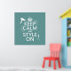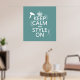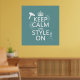 This reads Keep Calm and Style On, in the style of the classic keep calm poster. There are frills and spirals on the letters, and silhouettes of scissors and a hairdryer. This is a popular design with people in all aspects of the beauty industry, and makes great gifts too.