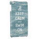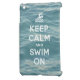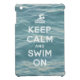 Funny iPad Mini case for swimming, diving or water sports fans with parody of the famous British slogan - Keep Calm And Swim On - and swimmer icon on blue sea waves.