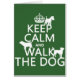 This is the classic war poster "Keep Calm and Carry On" reworded to "Keep Calm and Walk The Dog". There are silhouettes of dogs standing and sitting on and around the words. The design makes great presents or gifts for dog owners/lovers, or as a thank you for kennels/vets/rescue centres and dog walkers.