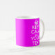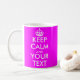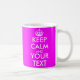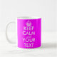 Keep Calm and your text mug | Hot neon pink colour. Personalizable Keep Calm Mug with custom colours like neon pink. Create your own funny Keep Calm and Carry On parody. Simply edit the text of this template to make a unique design. Popular examples are: Keep calm and party on. Keep calm and love me. Keep calm and drink tea. Personalised mugs are a great gift idea for friends and family.