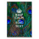 Your personalised Keep Calm saying on a fine custom colourful peacock feathers style decor. A personalised Keep Calm style saying on a one of a kind gift. Humourous or whimsical try on your creative words on two editable lines of text. Remember to use CAPITAL letters for best results.