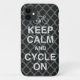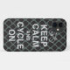 For the cycle enthusiast. Never loose your iPhone. Fun, cheerful fun cycle "Keep calm" design. Black and grey tones, trendy quatrefoil repeat pattern.
