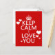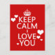 This reads Keep Calm I Love You, in the style of the classic keep calm poster. It's a romantic and stylish design, which is popular with everyone at valentines and birthdays alike. There are heart bursts around the words.