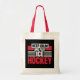 Hockey theme tote bag with text of black, white, and red that reads Keep Calm And Play Ice Hockey!