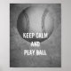 This keep calm quote poster has a baseball in grey and white with text keep calm and play ball for wall art decor in home or office.