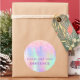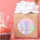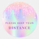 A sticker for the reopening of your beauty salon, business, or for a makeup artist after Covid-19, the corona virus. A trendy iridescent background with unicorn and rainbow pastel colours in pink, purple, rose gold, mint green. Decorated with faux glitter drips in rose gold, pink, purple. For makeup artists, hair and beauty salons. Purple coloured letters. The text: Please keep your distance.