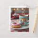 Say hi to a friend or family member with this sweet postcard featuring a strawberry doughnut and a cup of warm coffee at the diner. The coffee cup has a cute Kawaii cat. Cute pastel retro colours like pink and teal.