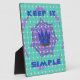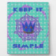 The central motif showcases a symbolic blue and gold crown, representing focus and inner royalty. This crown is set against a dynamic, geometric background: a teal/mint grid pattern overlaid with a purple and white radiating starburst. The powerful message "KEEP IT SIMPLE" boldly frames the top and bottom of the design. This combination of clean geometry and motivational symbolism is ideal for anyone seeking clarity and a mindful approach to their daily life.