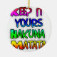 This artwork prominently features the phrase "KEEP IT YOURS HAKUNA MATATA" arranged in a stacked format. Each word is rendered in a distinct, vibrant colour with a bold black outline, creating an eye-catching and cheerful design.