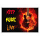 A burning acoustic guitar in full flame against a black background with the slogan "Keep Music Live" in flame colors of red, yellow and orange. A stunning effect to add to a wall, mantlepiece or other display feature. Ideal gift for guitarists, nusicians, heavy metal and live music fans.